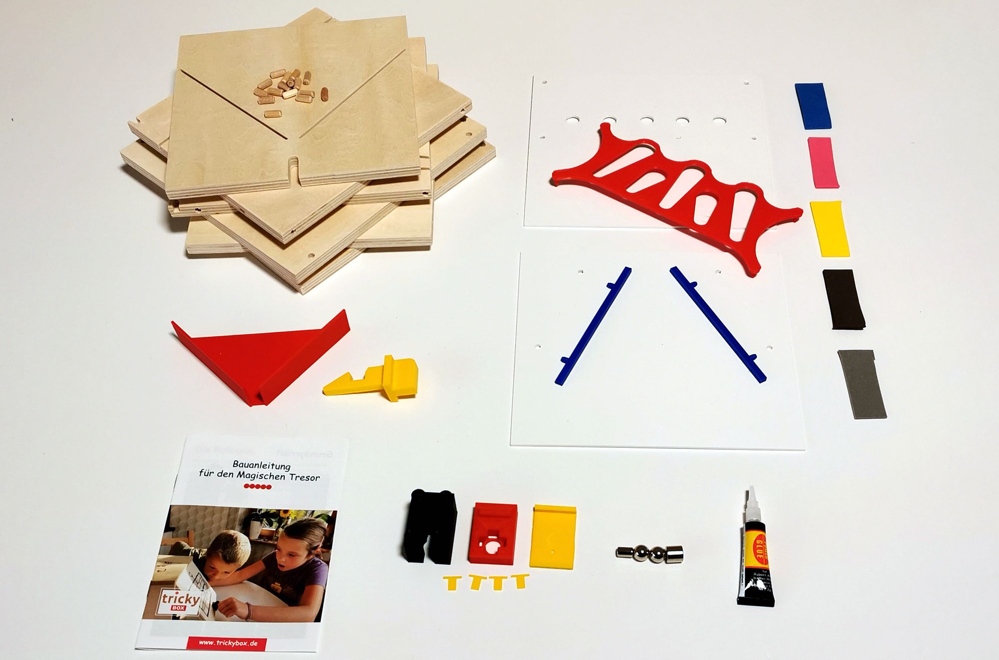 Das Ganze gibt’s komplett montiert oder als Bausatz. Wer sich als junger Ingenieur am Bausatz versuchen will, bekommt es mit Schichtholz und Dübeln, mit Moosgummi und Biokunststoff, mit Magneten und Kleber zu tun. Batterien oder Akkus gibt es nicht. Hier wirken einfache physikalische Gesetze, und nur aus der Kombination kommt der originelle Effekt. Na gut, ein Teil ist wirklich raffiniert konstruiert. Aber der Rest – Grundlagenwissen. Wer aber glaubt, den Tresor schon irgendwie anders aufzukriegen – so einfach ist es nicht.