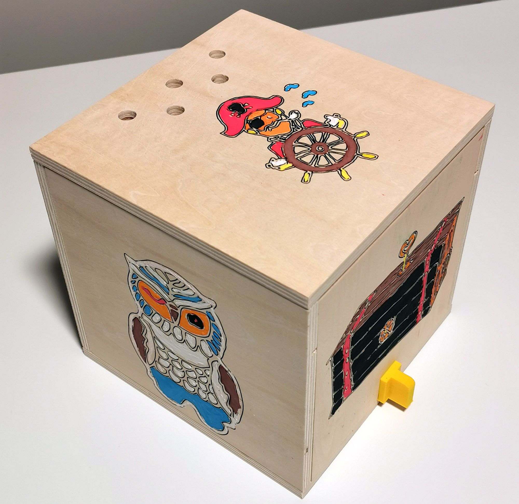Zum Schluss kann der Tresor nach Gusto bemalt werden. Seeräuber, Eule, Wunderlampe und Schlangenkönigin sind aufgedruckt und wollen aufgehübscht werden. Den Malkasten liefern wir auf Wunsch mit.
