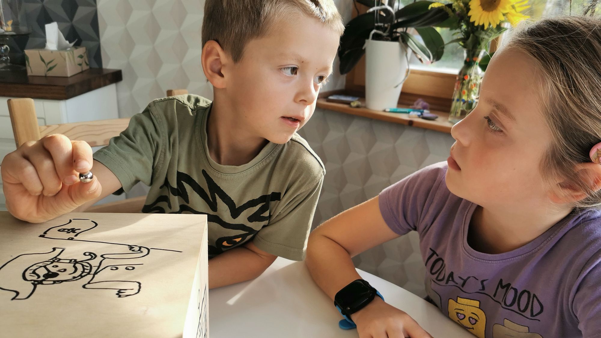 Gut ein Jahr haben wir daran herumgetüftelt. Jetzt ist er fertig: unser Magischer Tresor. Er hat kein Schloss, keinen Schlüssel. Er hat nur fünf Löcher. Und er öffnet sich nur, wenn man eine Kugel in eins der fünf Löcher steckt. Aber nur eins der fünf Löcher ist das richtige. Und das Beste: Jedes Kind kann einfach und schnell ein anderes Loch zum Öffnungsloch machen.