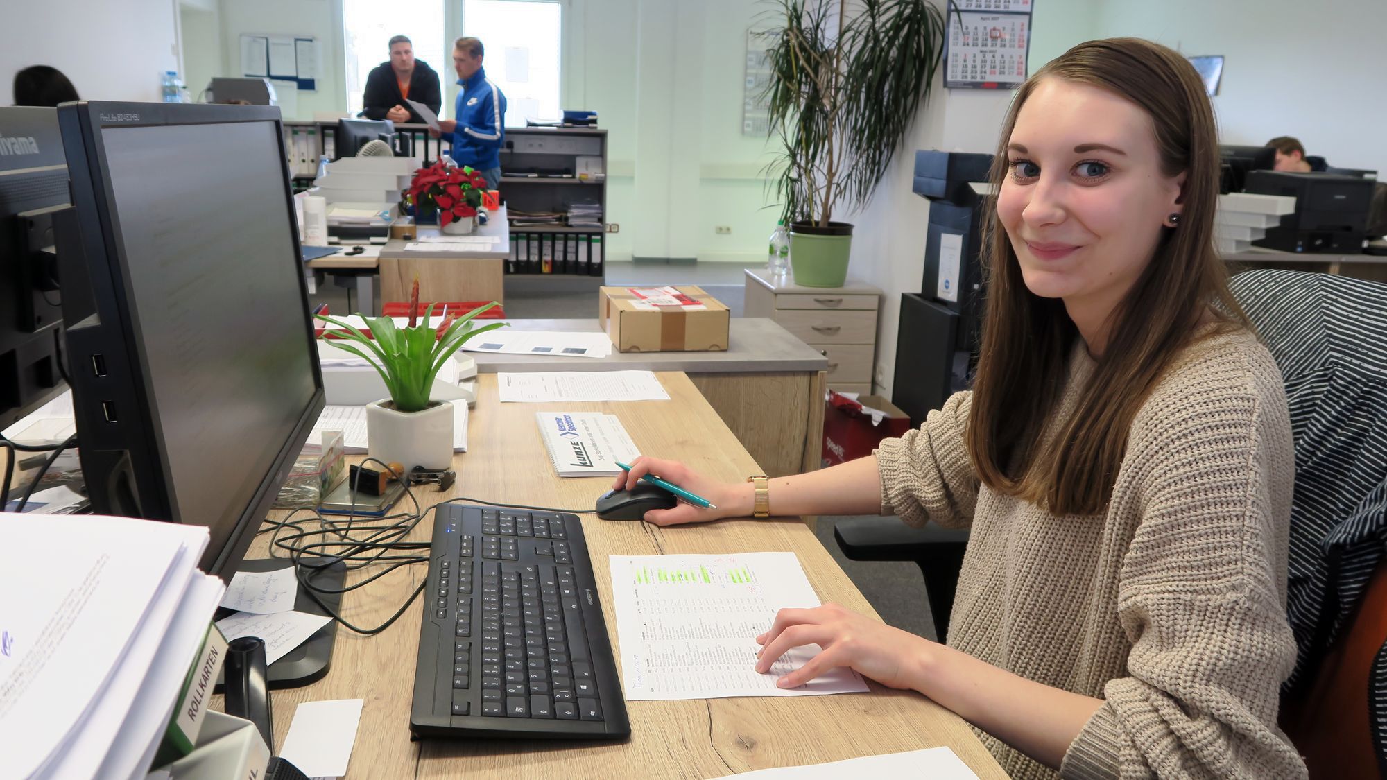 „Nette Kollegen“ – Caroline Roch fühlt sich KENTNER wohl.Das Unternehmen bildet aus. Aktuell lernen hier vier Auszubildende. „Wir brauchen immer Nachwuchs“, erklärt Matthias Kunze, deswegen sollen im Herbst vier weitere Azubis anfangen. Gesucht werden zwei Kaufmänner oder Kauffrauen für Spedition und Logistikdienstleistung und zwei Fachkräfte für Lagerlogistik. Mit einem guten Realschulabschluss hat man hier die besten Chancen künftig so einiges zu bewegen. Eine der Auszubildenden ist Caroline Roch, sie will Kauffrau für Spedition und Logistikdienstleistung werden. „Man braucht schon eine schnelle Auffassungsgabe, um die Aufgaben hier zu meistern“, sagt sie und lächelt. Computerkenntnisse seien auch nicht schlecht, und schwupps sind die Finger wieder flink auf der Tastatur.