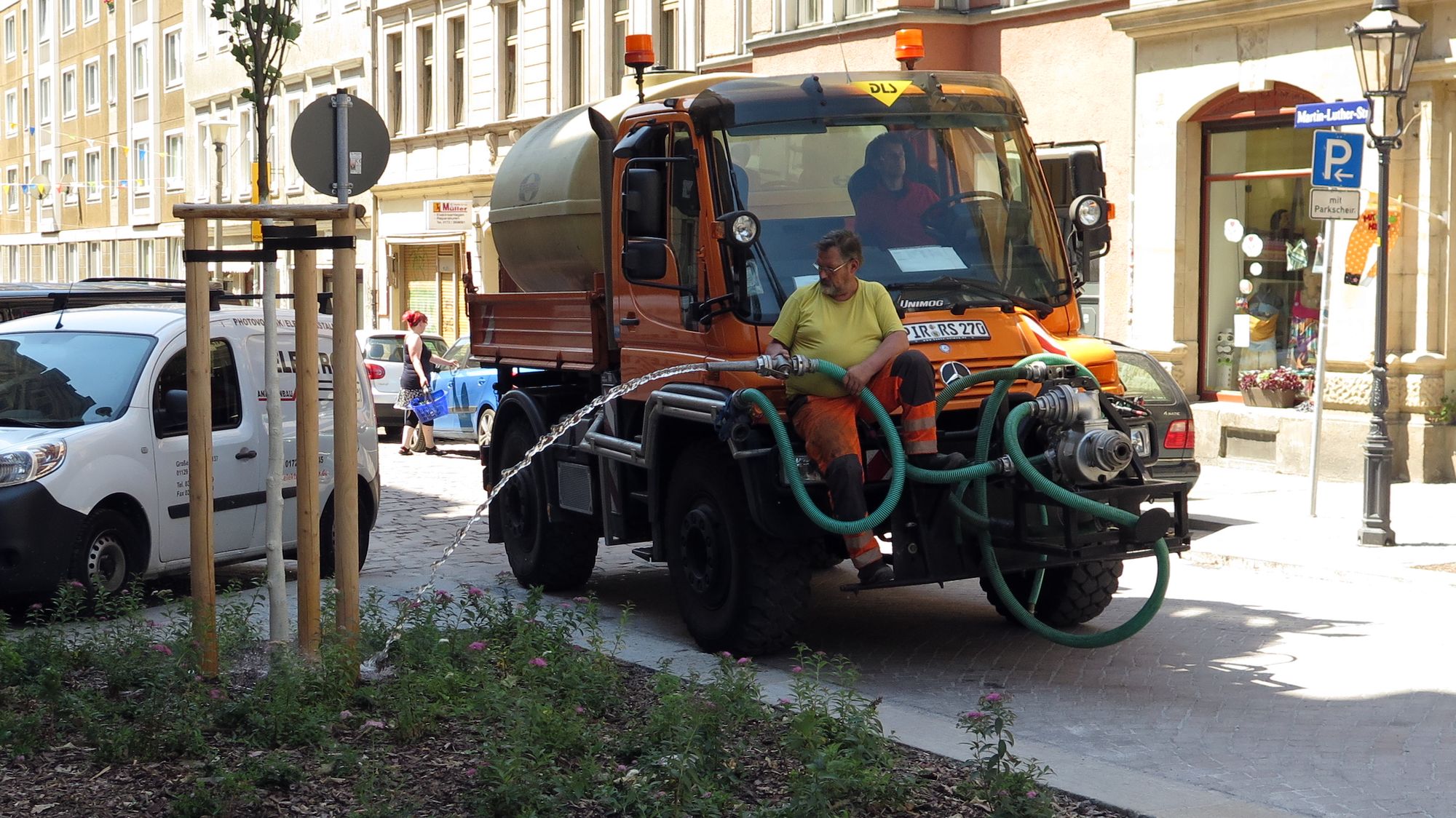 Die Straße brennt. Die Luft über dem Pflaster flirrt. Am Martin-Luther-Platz suchen sich Bauarbeiter ein schattiges Plätzchen. Am Springbrunnen Hochbetrieb.