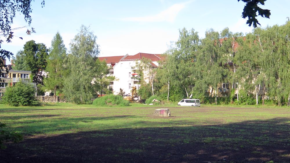 Seit heute wird gebaggert. Der Spielplatz mit dem Netz wird umziehen. Stadt braucht Spenden für Bäume und Bänke. Russensportplatz soll