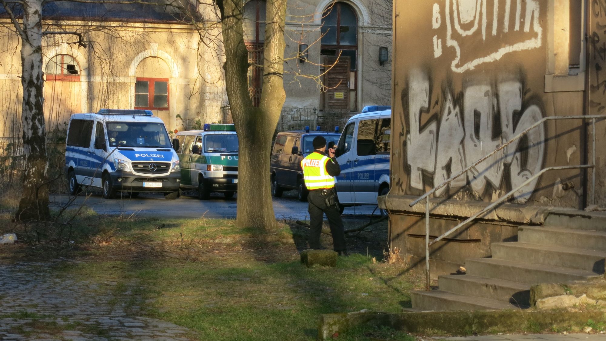 Schüsse fallen. Schreie. Ein Polizist steht mit einer Videokamera vor dem leerstehenden Haus an der Königsbrücker Straße 119. Im Hof
