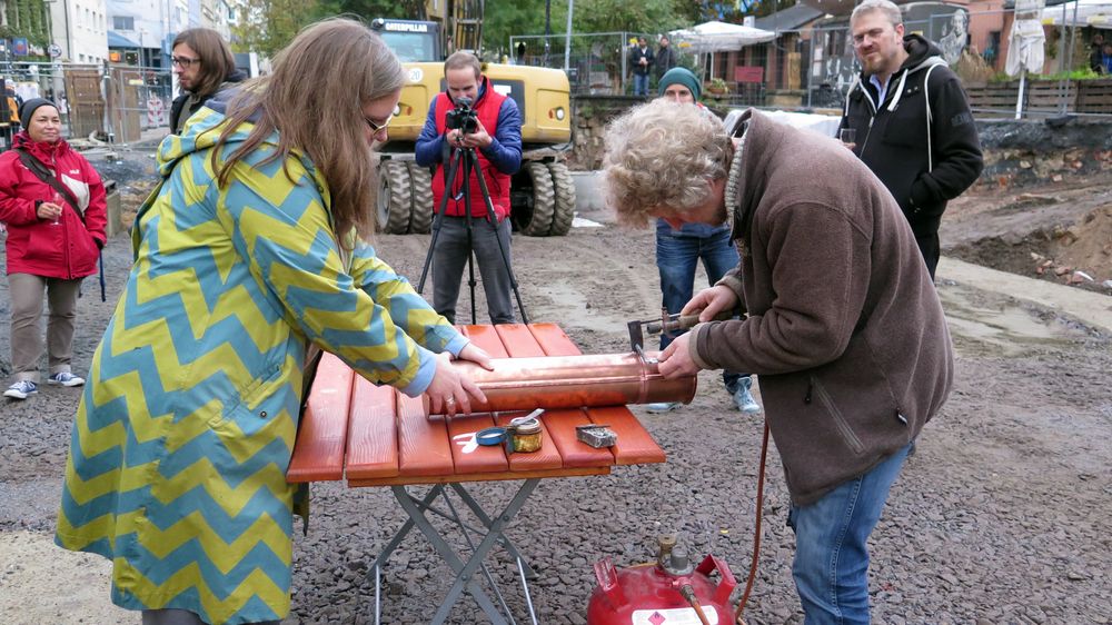Gestern haben Mitglieder der Schwafelrunde, der Stadtverwaltung und der Stesad gemeinsam den Grundstein für das BRN-Kunstwerk auf dem neuen Scheune-Vorplatz