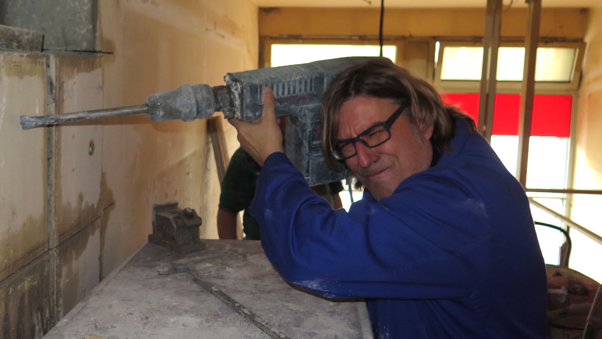 Der junge Mann steht ganz oben. Fast auf der obersten Sprosse einer làngen Leiter. In der Hand einen gelb leuchtenden