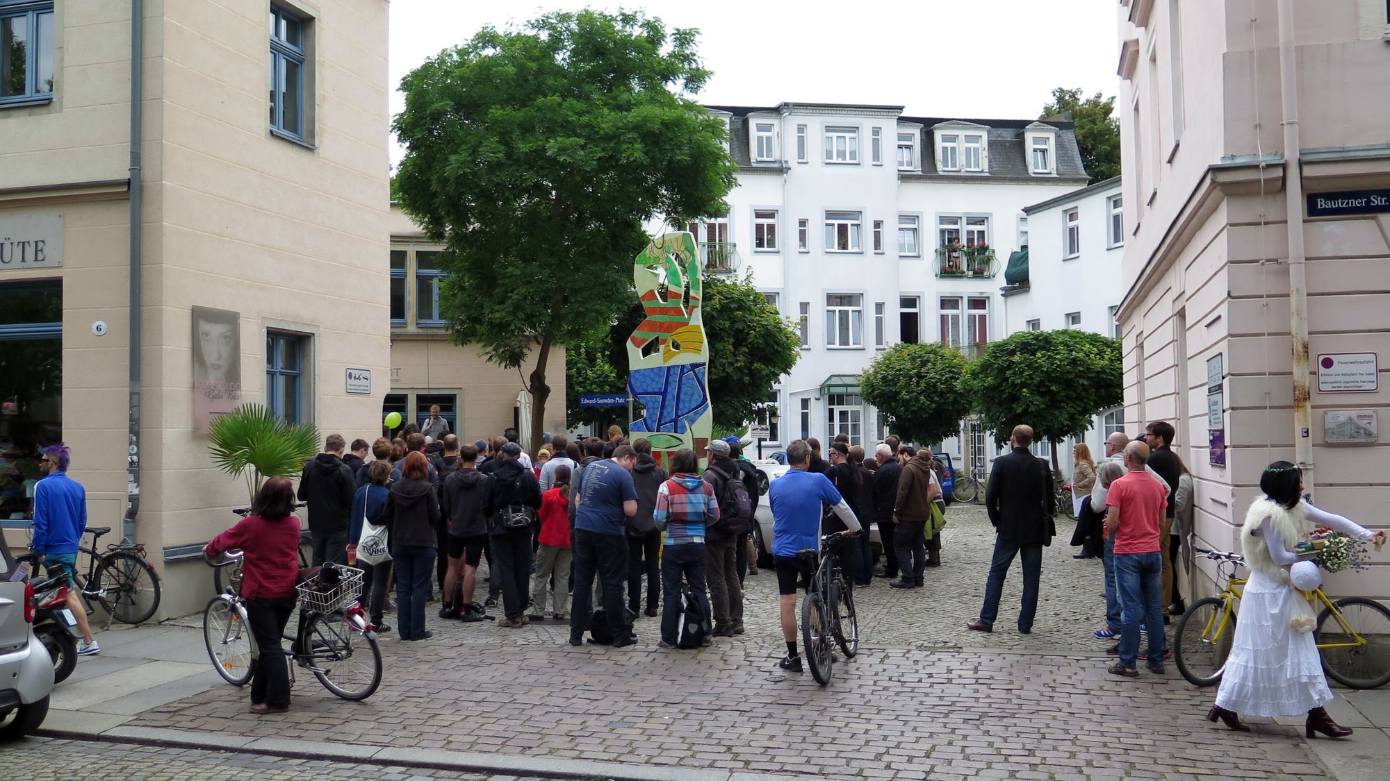 Um 14.30 Uhr wurde heute der erste Edward-Snowden-Platz in Deutschland eingeweiht. Die kleine Einkaufspassage zwischen den Häusern der Bautzner Straße